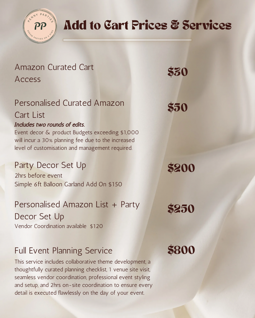 Amazon Party Package add-to-cart prices alongside comprehensive Full Event Planning Services.
